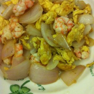 洋葱炒到七分熟左右加鸡蛋和虾仁料酒一起炒。