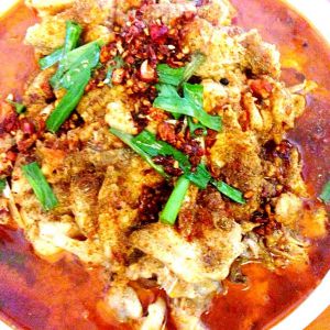 接着锅烧热,油一定要多,比平时做菜多两到三倍,放入两勺郫县豆瓣,一大把花椒,葱姜蒜段爆香,注水,水开后放入鱼骨段,由于腌制过,很好烧,开火后两三分钟差不多就可以了,抄起来入盘,依次放入腌制好的鱼片,在锅里抖散开来,水开再煮两分钟,连汤带鱼全部装盘