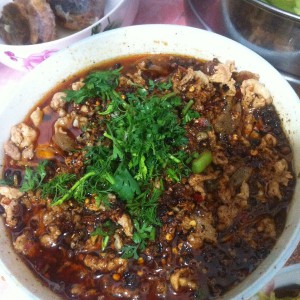 在表面铺上蒜末、干辣椒面,锅中加油,烧热(油温必须够高)。将热油浇到蒜和干辣椒面上,撒上香菜即可。