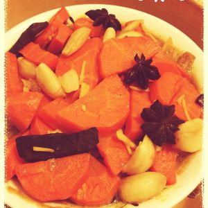 锅中倒入400ml清水煮滚,将猪肉,胡萝卜(土豆稍后),生姜,大蒜,八角,桂皮以及腌肉的汁一起倒入锅中,并放入五香粉,中火煮20分钟,再加入土豆继续煮10分钟。