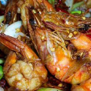 锅内倒入油,记得要多一些,比平日炒同样份量的荤菜油多一倍吧 大火烧油至辣,倒入虾。