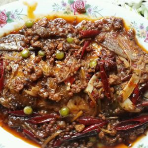 炒锅上火 油热后依次放入肉沫花椒八角桂皮豆瓣葱姜蒜炒香烹入白酒酱油锅內加水放入盐白糖胡椒粉烧开放入鱼改小火少半小时