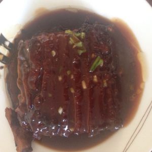 取一个盘子倒扣在碗上,将肉倒扣在盘子里,汤汁倒入炒锅中,用水淀粉勾芡,放入鸡精调味后倒入香油,淋在肉上即可。