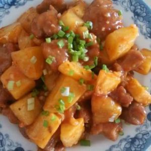锅里留少许油,加入糖、醋、盐、蕃茄酱、水淀粉调匀,再倒入炸好的肉和土豆翻炒入味即可出锅装盘,最后撒上葱花!美味的荔枝肉完成啦