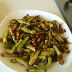 煎炒至芸豆酥透以后,下花椒粒、干辣椒、蒜末煸香,依口味加入适量六月香豆瓣酱或甜面酱少许,煸几下喷入适量酱油一起煸炒。