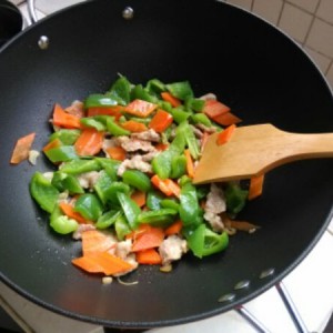 热锅放油,爆香姜蒜,加入肉片,爆炒大概4分钟,再加入灼好的青椒胡萝卜,加少量水,胡椒粉,盐,兜匀,熄火上碟。