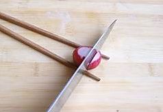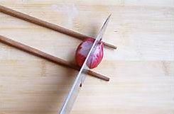 然后转过来,下面放两根筷子,把薄片切成丝状