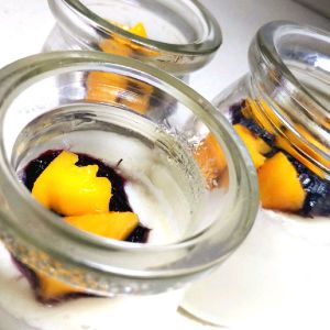 把液体倒入玻璃瓶盖上盖子或是保鲜膜防止进水!水烧开后蒸10分钟就可以了!蒸好后闷几分钟就可以放进冰箱冷藏后放入自己喜欢的水果等各种料!