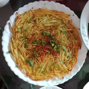 锅种烧较多的油,放入土豆丝摆成圆形,翻一到三次