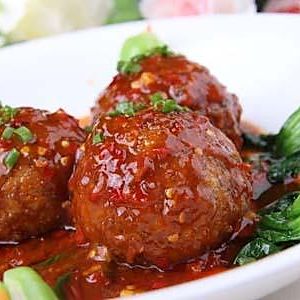 锅里放油烧热,将丸子逐个放入油中,用勺子舀起热油轻轻地浇在狮子头 上,中大火炸到丸子有些上色,外壳稍微变硬捞出