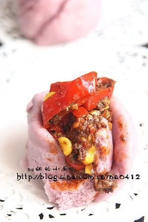 把酵母放入水中溶化,紫薯蒸熟冷凉,暗成泥状,把料全加入盆里,揉成面团。