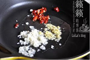 锅烧热注油,中小火将花椒粒爆香后捞出扔掉,下蒜末、姜末、干红椒圈煸香;