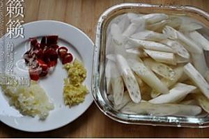 将藕带洗净,表皮难以洗净的部分用小刀轻轻刮除,将藕带斜切成段用流动水冲洗干净后浸水(以免氧化变色)备用;将蒜去皮切末、生姜切末,干红椒去蒂去籽后剪成圆圈状备用;