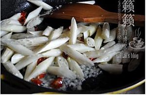 灶火调大,将藕带控水后倒入锅中翻炒;