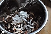 依次将所有香菇剪成鳝鱼形细条状;将香菇条放入大容器中,撒上少许盐及胡椒粉抓匀,一边用筷挑抖香菇条一边撒上生粉,使每根香菇条都均匀地包裹上生粉;