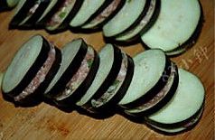 取适量肉馅在茄夹中间,用手轻轻压实抹平。