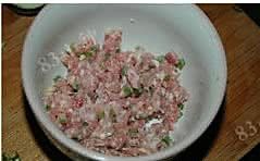 肉剁成沫,加葱姜末,盐,鸡精,料酒,生抽,生粉,胡椒粉,蛋液,少许清水拌匀搅上劲。