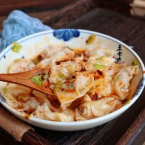最后捞入馄饨加入适量的红油辣子及西芹叶搅拌均匀即可