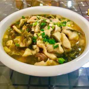 肉一片片下,尽量展平不卷曲,动作快点,直至最后一块酸菜鱼完成,加点味精出锅