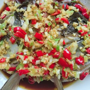 把蒜末姜末葱末过油爆香洒在鱼头上,上蒸锅蒸20分钟