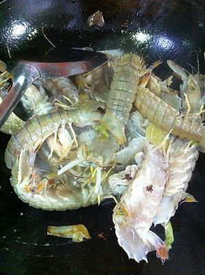 放入皮皮虾, 倒入少许黄酒(我用的料酒)大火翻炒