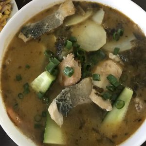 热锅下油,放入姜片,鱼骨头和鱼头炒下,放入适量水煮鱼料,翻炒,再放入雪菜、蒜头,再炒,倒入开水,放土豆!煮开后,放入鱼肉和青瓜!煮熟出锅,撒葱花!