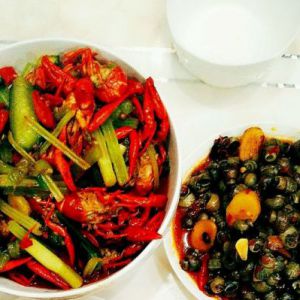 小龙虾去头,抽线。黄瓜,芹菜切段,辣椒切块。
