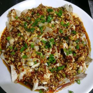 将葱蒜末,熟芝麻,熟花生碎,辣椒油,盐半勺,糖一勺,鸡精半勺,海鲜酱油三勺,醋一勺,鸡汤俩大勺(我用的盛粥的大勺哦)