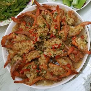 把炒香的蒜青红辣椒末均匀的放到虾上面,腌制虾的生抽倒入里面,锅里水烧开,蒸9分钟就可以吃了。