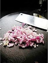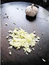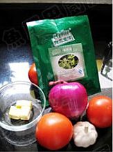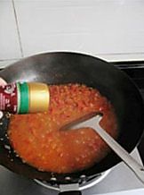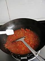大火翻炒,炒到洋葱末呈透明状时,加入番茄粒。
