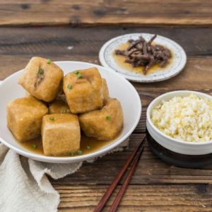 取油豆腐 ,酿进糯米粉馅。酿满,如图。