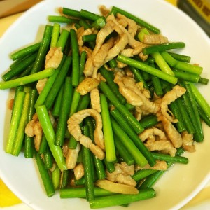 锅洗干净,热锅热油,倒入蒜苔翻炒。