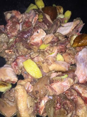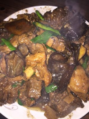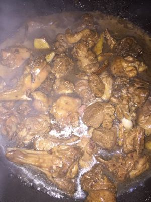 放入鸭肉炒至金黄色 放入糖和盐 酱油