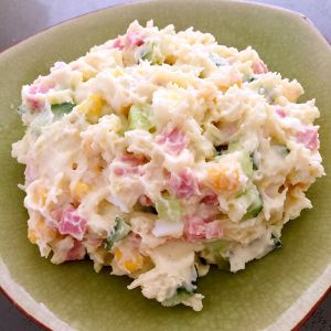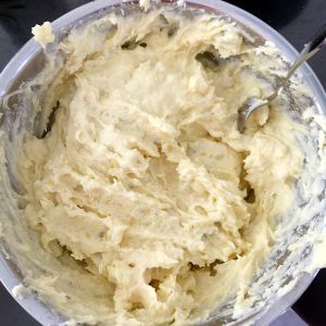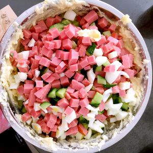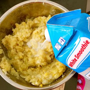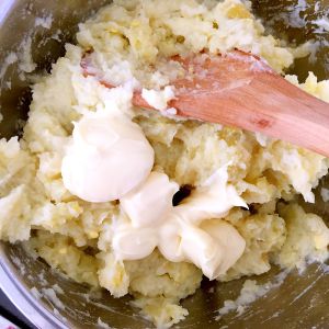 将沙拉酱与土豆泥混合,沙拉酱可以多放些。我大约用了半瓶。