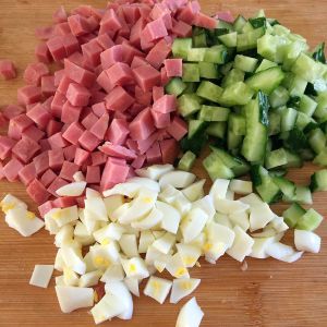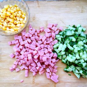 将火腿和黄瓜切小丁,玉米粒切小丁。火腿我选的是迎宾老火腿,玉米粒超市卖的速冻的买回用开水焯下即可。