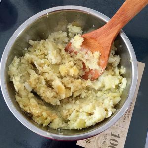 土豆洗净后每个切成两半,电饭锅或高压锅中蒸熟。时间每种锅有差异,以筷子轻松戳入变软为准。然后剥皮压成土豆泥。