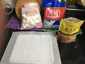 放入黄油 成汁 放入棉花糖 融化 倒入奶粉搅拌 倒入花生碎 继续搅拌 出锅 放入盘内