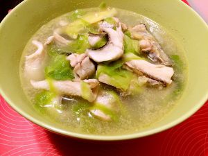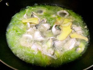 备好材料后,先准备上汤,然后放入苦瓜青及鱼头鱼骨头,待汤烧开后小火煮5分钟。最后把鱼片放进汤里,放鱼片后汤再次烧开立即关火,但不要马上掀盖!在锅里闷5分钟后完成!