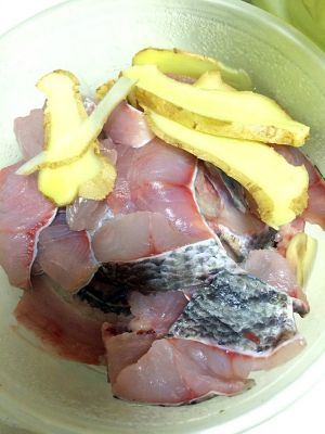 把生鱼起双飞!保留鱼头鱼骨用于汤底!也可以吃!起片后放上姜片!