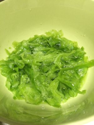 苦瓜清洗后,用刨子把苦瓜刨成一片片,只需要青色部分,刨到见白肉就不需要了!刨好的凉瓜青用盐腌制10分钟左右,然后用清水清洗一遍,晾干备用!
