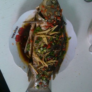 姜切片,大蒜切片,东北大葱切丝,红辣椒切末,把这几个材料摆在盘子里,鱼肚子也塞满,在鱼身上放上姜丝,也放点辣椒末,再在鱼身上淋上蒸鱼豉油,放入锅内开火,大火蒸20分钟,关火闷上5分钟,