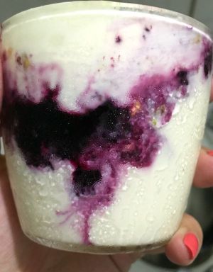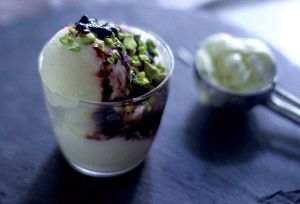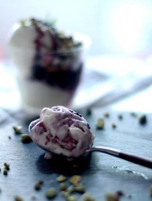 柠檬酸奶冰激凌的味道很包容,加入自己熬的蓝莓酱和烤过的开心果碎,吃起来更美味