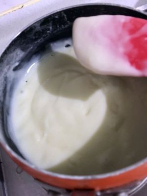 余下的牛奶、淡奶油、白砂糖(如果有柠檬皮屑的话,这里放入)混合煮沸,离火。缓慢倒入3中的液体,一边倒入一边搅拌。均匀后倒回到锅中,再次煮沸,由于玉米淀粉的原因,液体很快粘稠。记得一定要搅拌顺滑无颗粒感