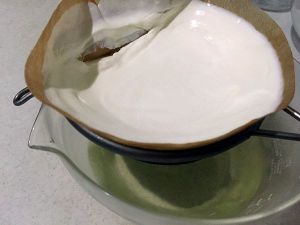 酸奶脱水。要提前一晚上做准备。如果选用有糖的酸奶,则以上糖量要相应减少。我用的是自己做的无糖酸奶。酸奶要脱水,更浓稠。一般是垫几层纱布置于滤网上,我没有纱布,我也很迷惑到底要去哪里买纱布呢?不过,我有终极大招,那就是咖!啡!滤!纸!比纱布更细腻。下图是过滤一晚的结果,夏天,记得放在冰箱里,防止变质酸败。