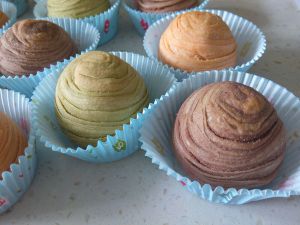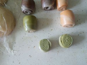 取刚才处理好的第一个面卷从中间切一刀,一分为二,切面朝上,注意是切面向上。这样本来六个面卷就变成十二个了。