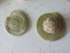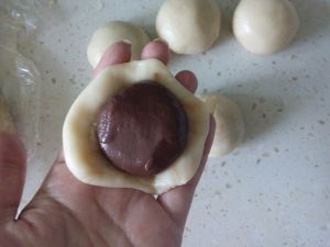 切面向上的面卷,按压一下,再擀成中间厚四周略薄膜的面皮,包入豆沙馅。收口捏紧向下放置。