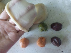 将面皮面团材料混合均匀,揉至光滑,一定要光滑,多揉一会儿。盖膜静置半小时以上,就能抻出这种薄膜了。油酥面团混合均匀后,分成45克一份的三等份,分别加入抹茶粉、可可粉和黄金芝士粉,混合均匀盖膜备用。在静置的时候可以将豆沙馅分成40克一份,团成团,共12个。