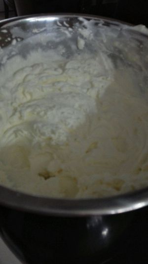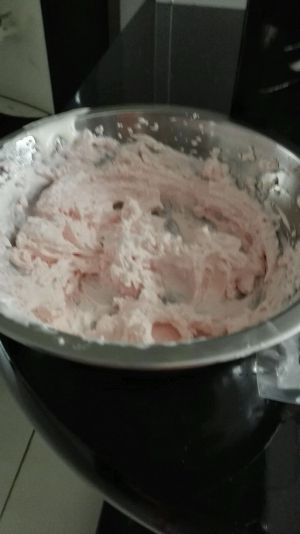 200克奶油加入15克糖,打到五成发,滴入几滴火龙果汁,继续打至裱花状态。