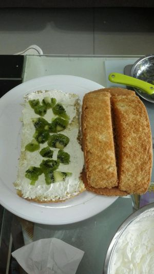 底层蛋糕一分为二,涂上奶油,放入水果。