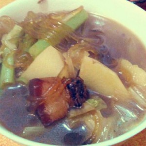 五花肉在高压锅内炖够半小时后,将高压锅内的气放完。然后另起一煮锅将肉及汤倒入,蔬菜粉条也一并倒入再加点开水,使水没过所有食材,放入盐。大火烧开后继续炖15-20分钟。关火前放入鸡精搅拌关火。